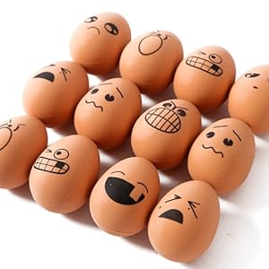 These are 24 rubber bouncing eggs with emoji faces that look like real eggs. They are great for pranks, party gifts, goodie bag fillers and more. These durable balls are about 2" in size and come in colors that are identical to real eggs.
