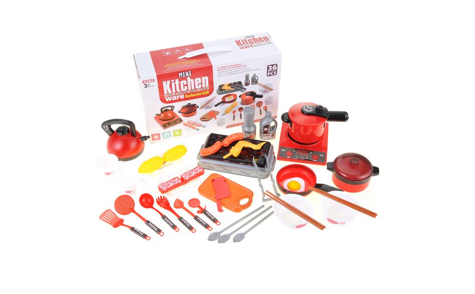 36 Pcs Deluxe Kitchen Play Set and Accessories | Kitchen Cooking Pretend Toys with Pots and Pans, BBQ Grill, Utensils, and Play Food | Educational and Fun Gift for Boys and Girls 3+