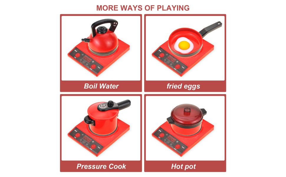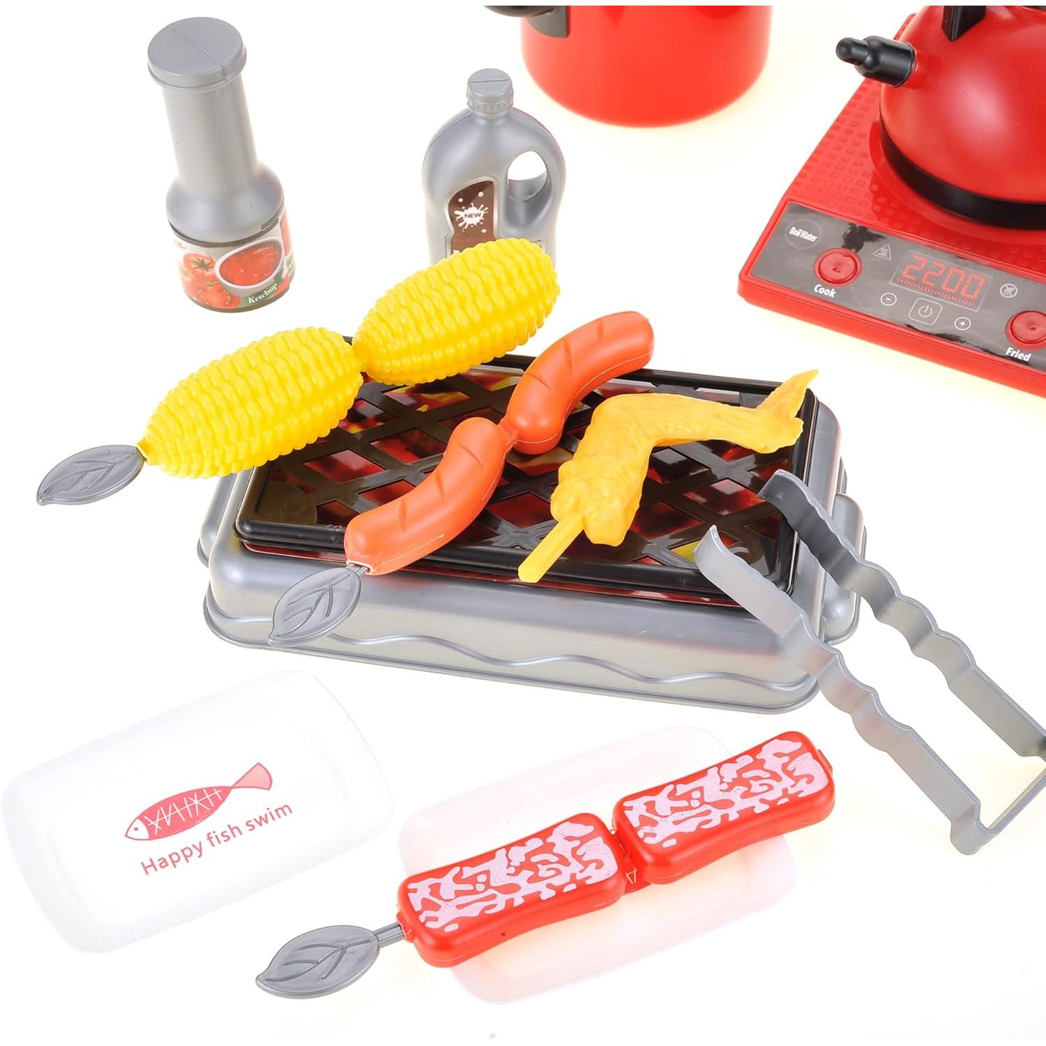DELUXE KITCHEN SET : Play set comes with 36 pieces. Includes kitchen accessories, pressure pot, pans, induction cooktop, kettle and barbecue grill, along with play food and utensils.