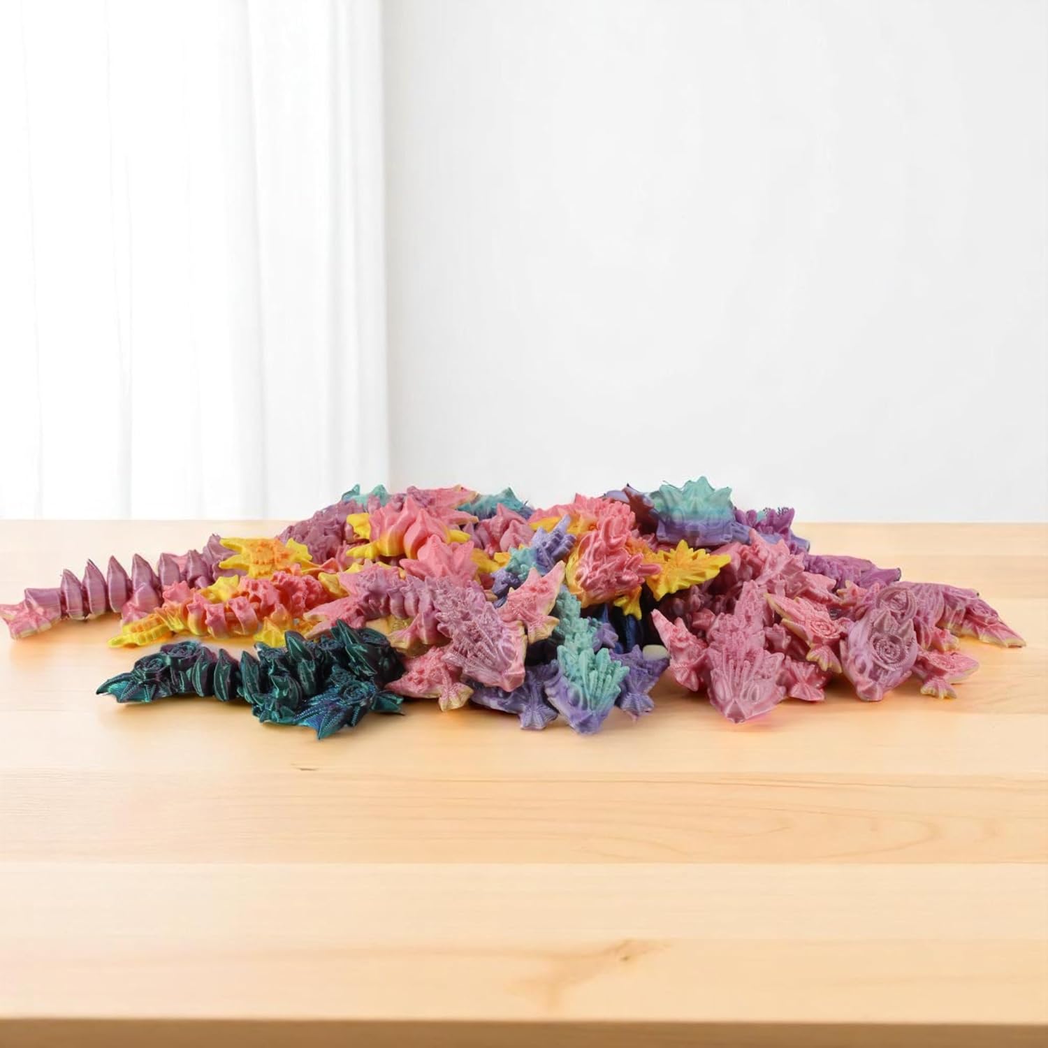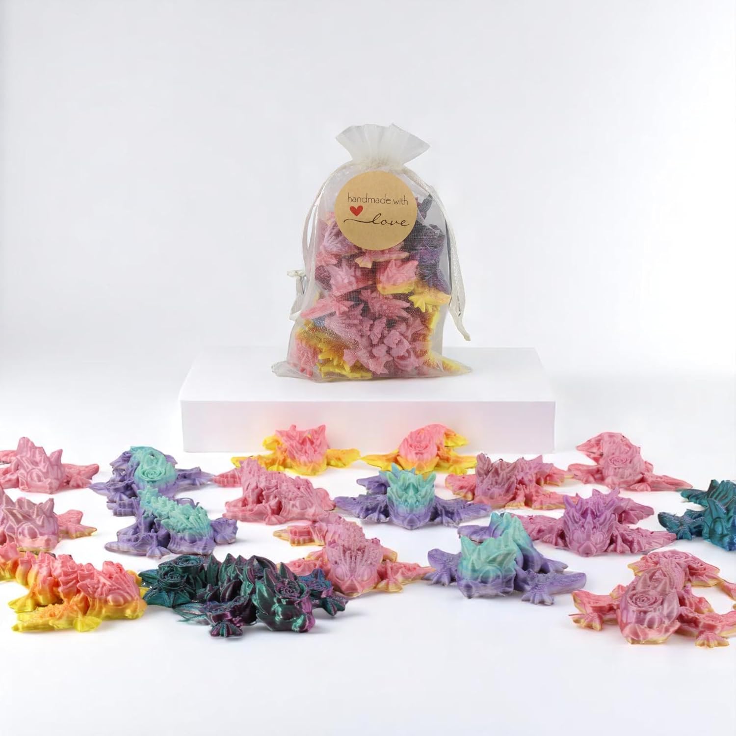 Bring a burst of fantasy to your collection with this pack of 10 3D Printed Baby Dragon Wyverns! Each dragon is approximately 3 inches long and features an articulated, poseable body with intricate design details. Printed in a dazzling mix of rainbow colors, these dragons are fun to fidget with, display on your desk, or share as party favors and gifts. Whether you're a collector, fantasy fan, or looking for something unique to share, these dragons add a magical touch. Comes with a reusable clear drawstring bag. Made in the USA. For ages 16 and up.