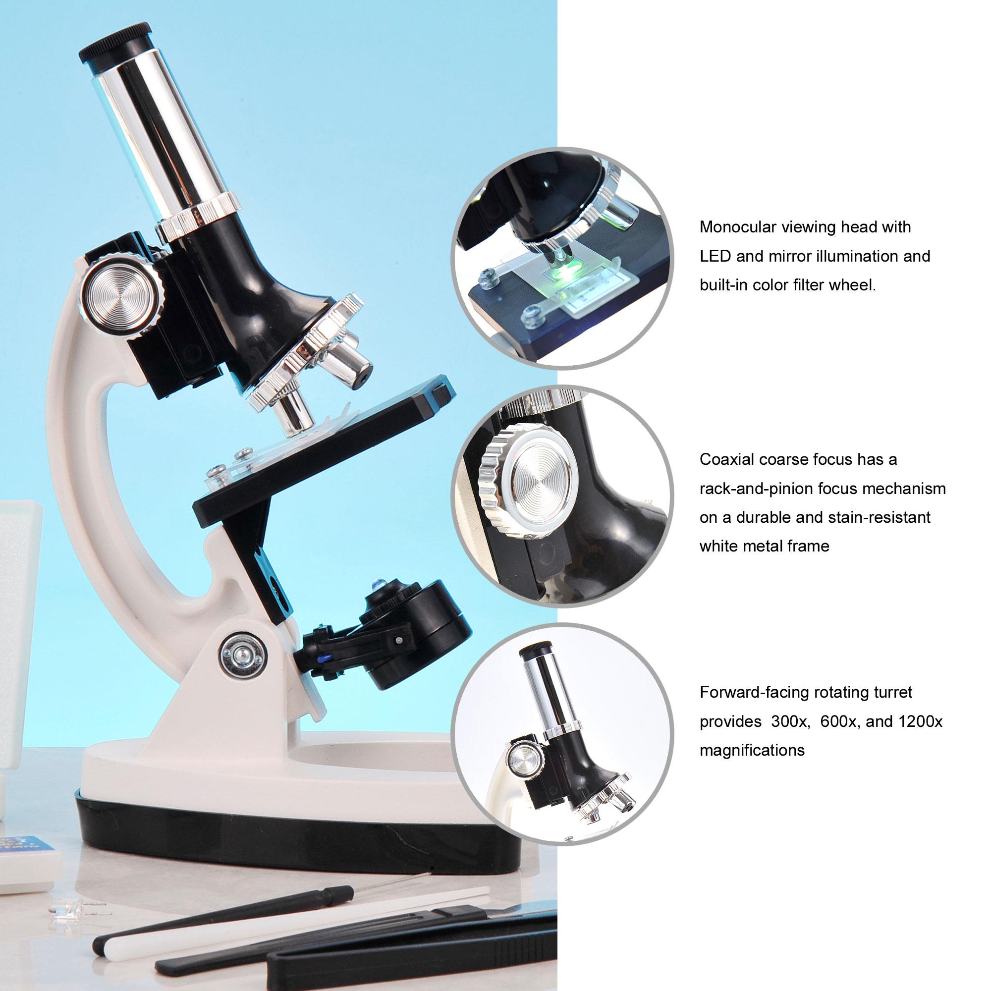 Magnification: Equipped with six magnification settings from 120X to 1200X, this compound microscope enables young scientists to examine a variety of specimens in fine detail
