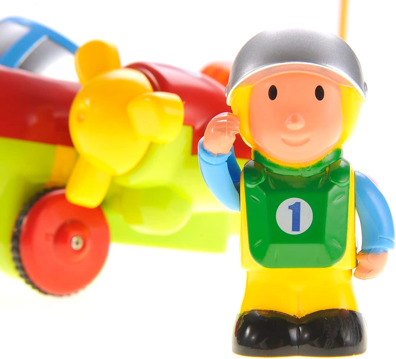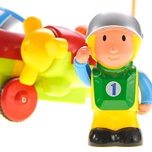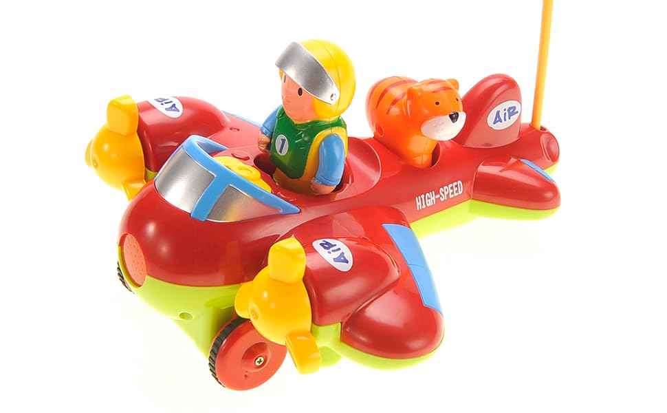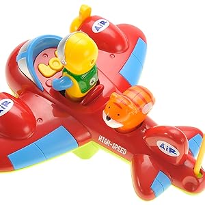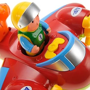 This adorable cartoon airplane has spinning fans on both wings, colorful lights, and a catchy nursery rhyme that can excite children. It also includes a removable pilot and a small animal friend that kids can play with in or outside the plane.