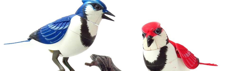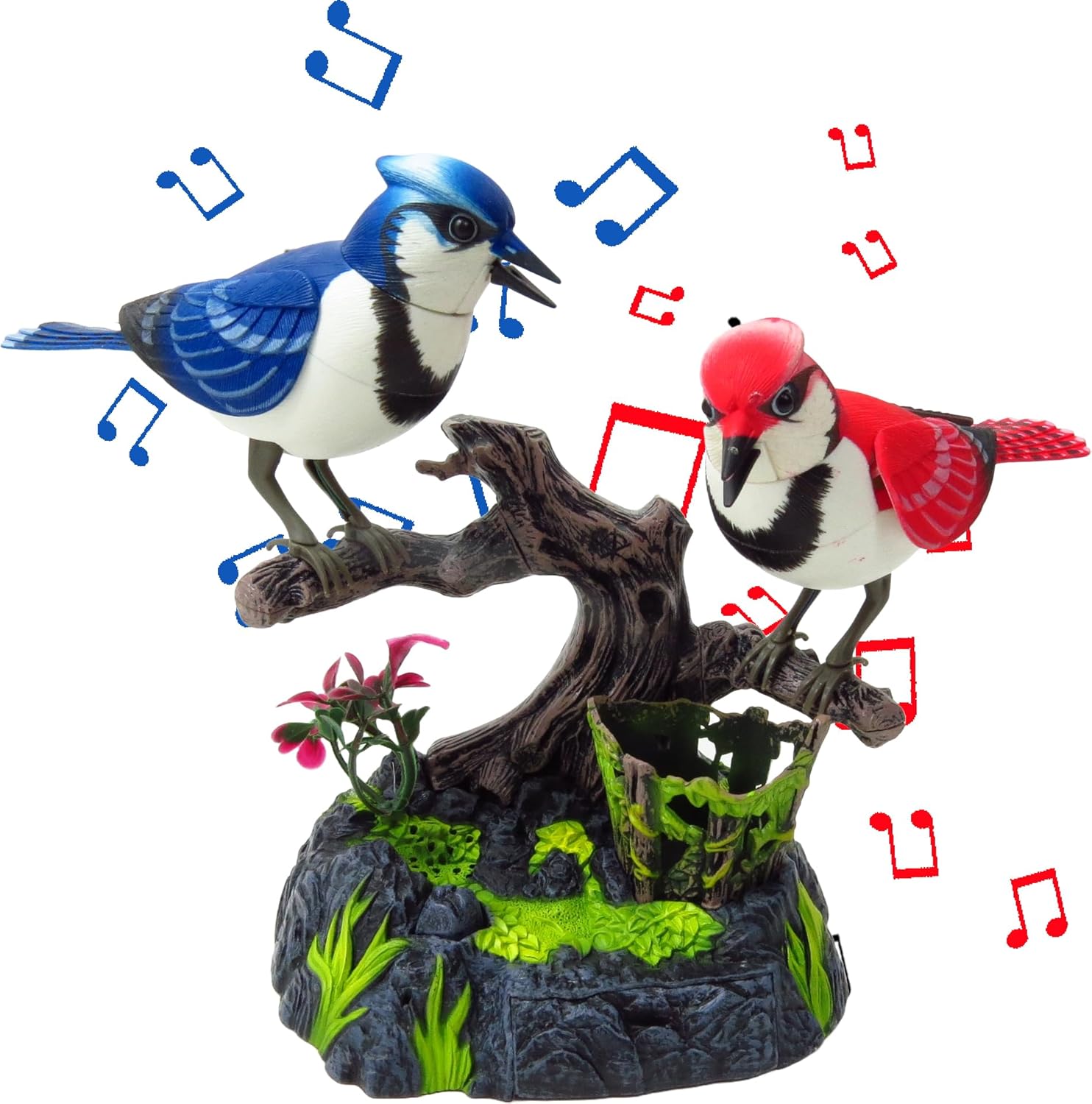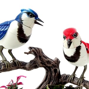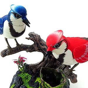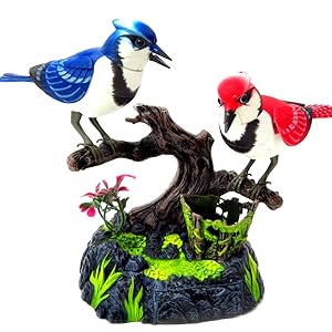 Your friends and family will be amazed on both realistic design and sounds. These birds are based on the common blue jay, one of the most loudest birds native to eastern North America. The perch is literally a replica of a tree trunk and has little with lush green leaves to make it more realistic. The blue jays themselves are colored from red to blue, expressing authenticity.