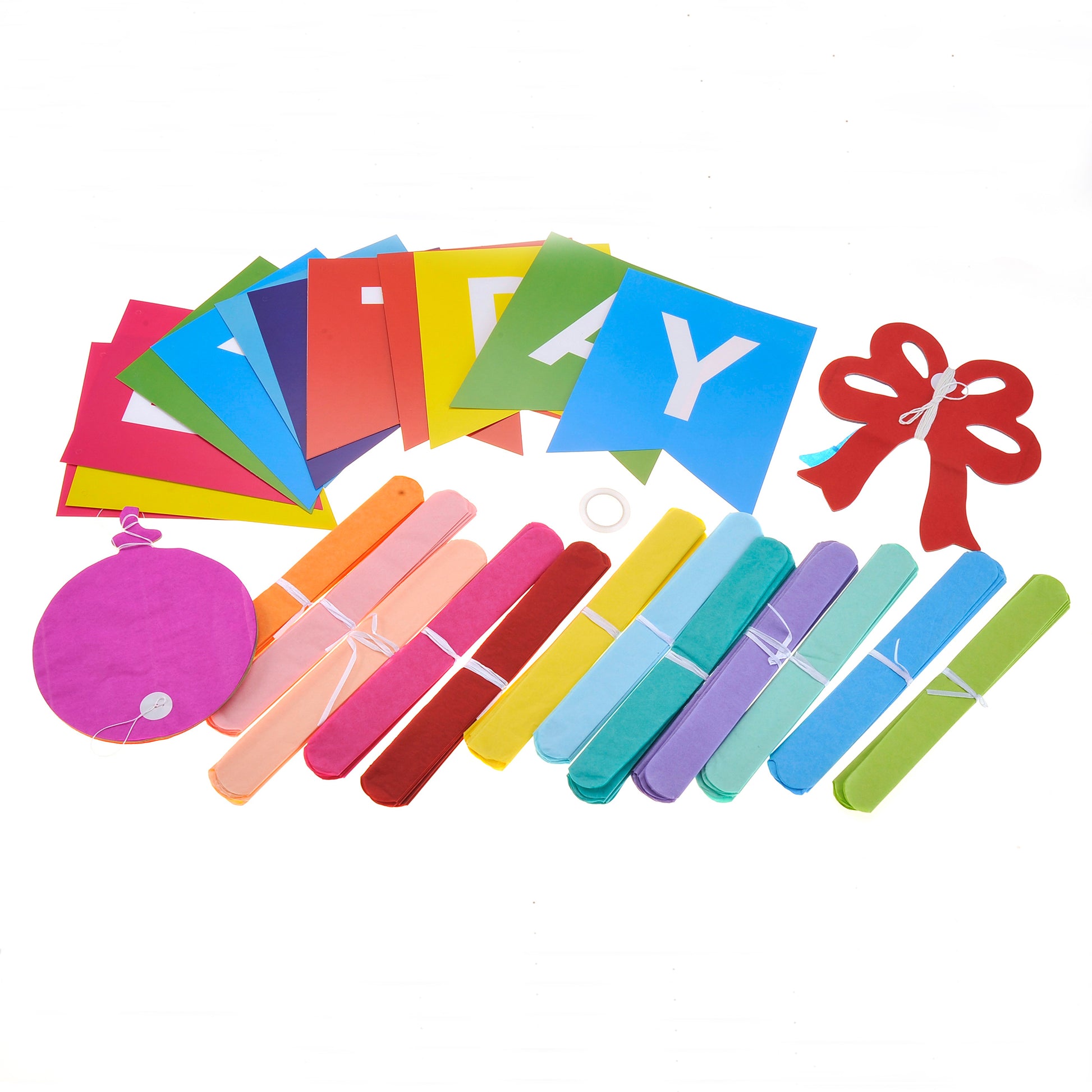 All-in-one Happy Birthday party decoration package. Quickly design your party with quality paper decorations of all the colors of the rainbow. Contents include Happy Birthday banners and other colored decorations like paper poms poms that will enhance your party experience in many vibrant colors.