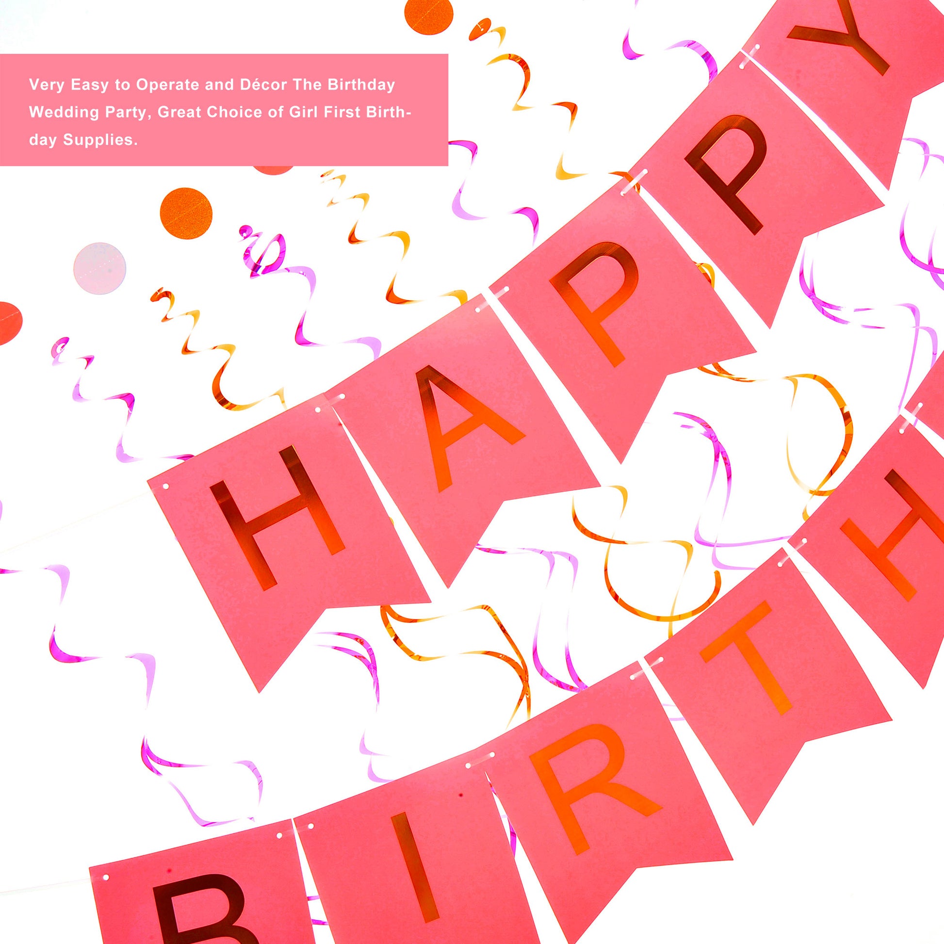 Happy Birthday party decoration set. Decorate your amazing birthday parties with a setup of quality paper decorations in classy pink and gold. Contents include Happy Birthday banners and other colored decorations like paper poms poms that will enhance your party experience in many vibrant colors.