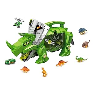 A dinosaur carrier toy that contains miniature dinosaur figurine, vehicles, and helicopter. The dinosaur carrier has a built-in handle on top, so kids can conveniently hold it and take it where ever they want . Additionally, the carrier has wheels on the bottom of the foot making it a dino vehicle. This dinosaur set comes also with 6 different type of miniature dinosaurs, 1 helicopter, and 3 land vehicles.
