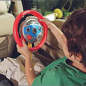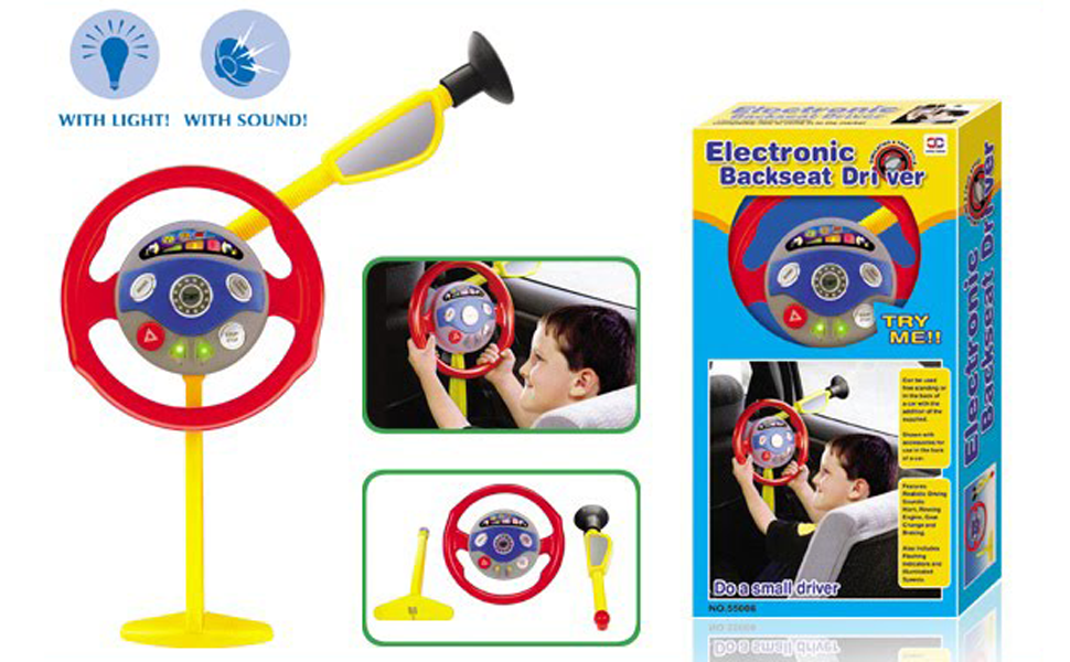 Buckle your seat belts and take this wheel out for a spin. This electronic backseat steering wheel will keep your little backseat driver entertained in any car trip. Now they can imitate what mom or dad does behind the wheel. This product is fully loaded with fun features which includes a horn, engine revving, gear change, and turning indicator sounds.