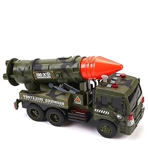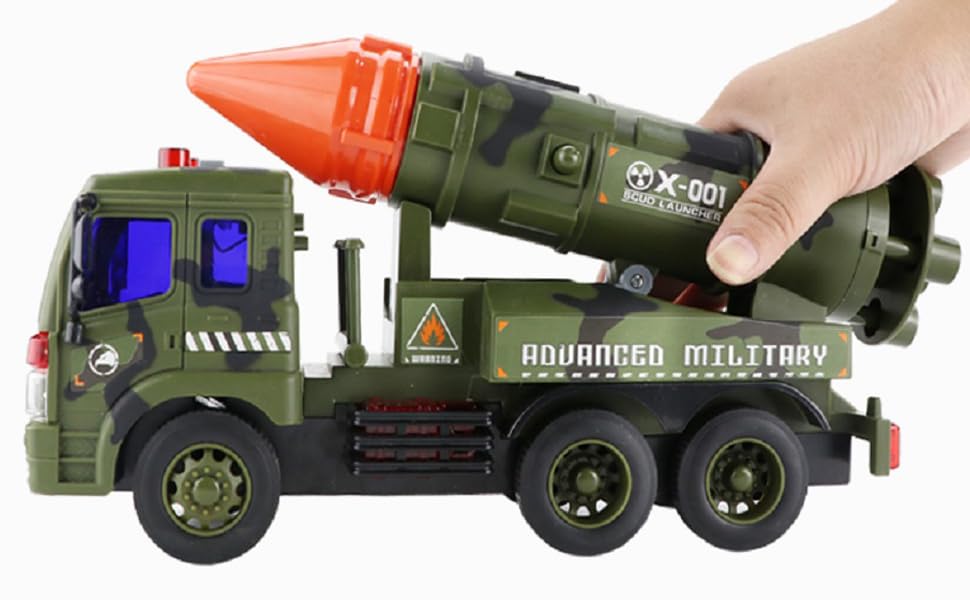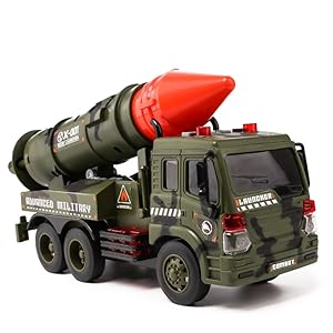 Friction powered military truck with lights and sound. Comes with a missile launcher on top of the truck that is movable. Simply push and watch the friction powered truck go.