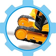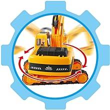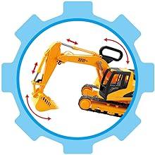 EASY TO OPERATE: Designed for small hands, the excavator is easy to control, making it ideal for kids ages 4-8 and toddlers ages 3-5. Easy to operate with a handle that controls the scoop, lifting and digging for added play. The cabin swivels 360 degrees, has rubber tire link tracks, and the back hood opens to reveal a ventilator grill for extra fun.