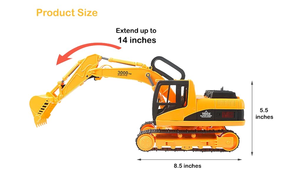 1:22 SCALE MODEL: The excavator is a detailed 1:22 scale model, providing an authentic and engaging experience for young construction enthusiasts. Measures 8.5" x 5.5" x 5.5", with a powerful shovel arm that extends up to 14", making it ideal for both indoor and outdoor adventures. Let your child dig into some serious fun!