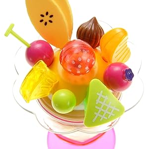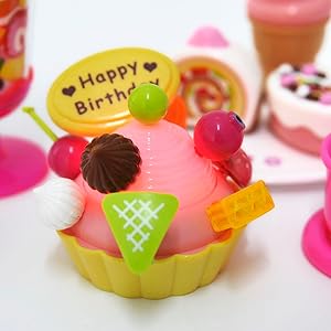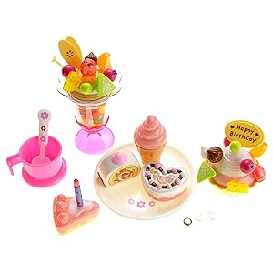 This birthday party set looks delicious! The cupcake lights up and sings a birthday song. The cupcake can also be decorated with different toppings. This food play set also includes cake slice, heart cake, sponge cake, ice cream, sundae, cup and spoon.