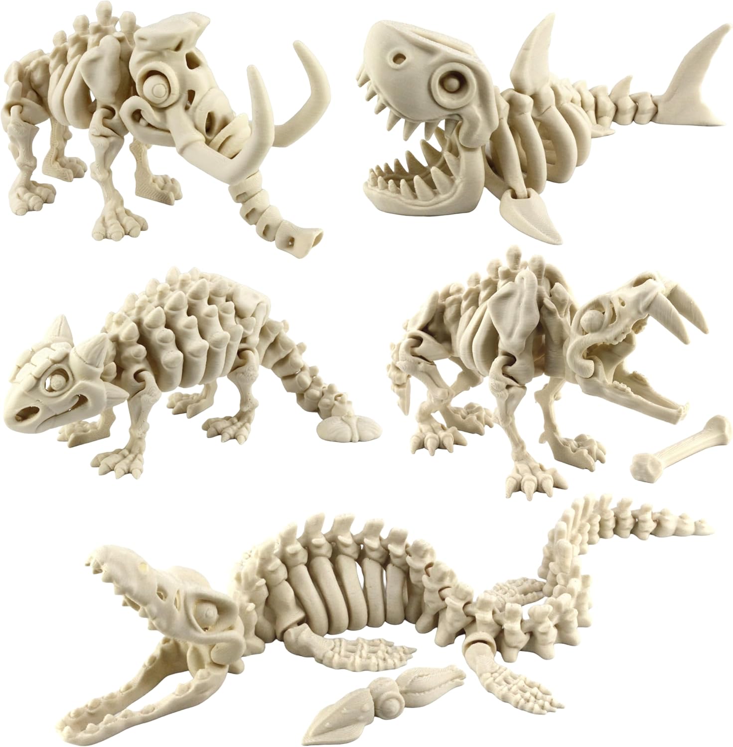 PowerTRC 5PCS 3D Printed Dinosaur Skeletons, Fidget Toys, Mosasaurus Ankylosaurus Mammoth Shark Saber Tiger Toy, 3D Printed Dragon Animals Toys, Articulated 3D Figurine Stress Relief Toy Bone White