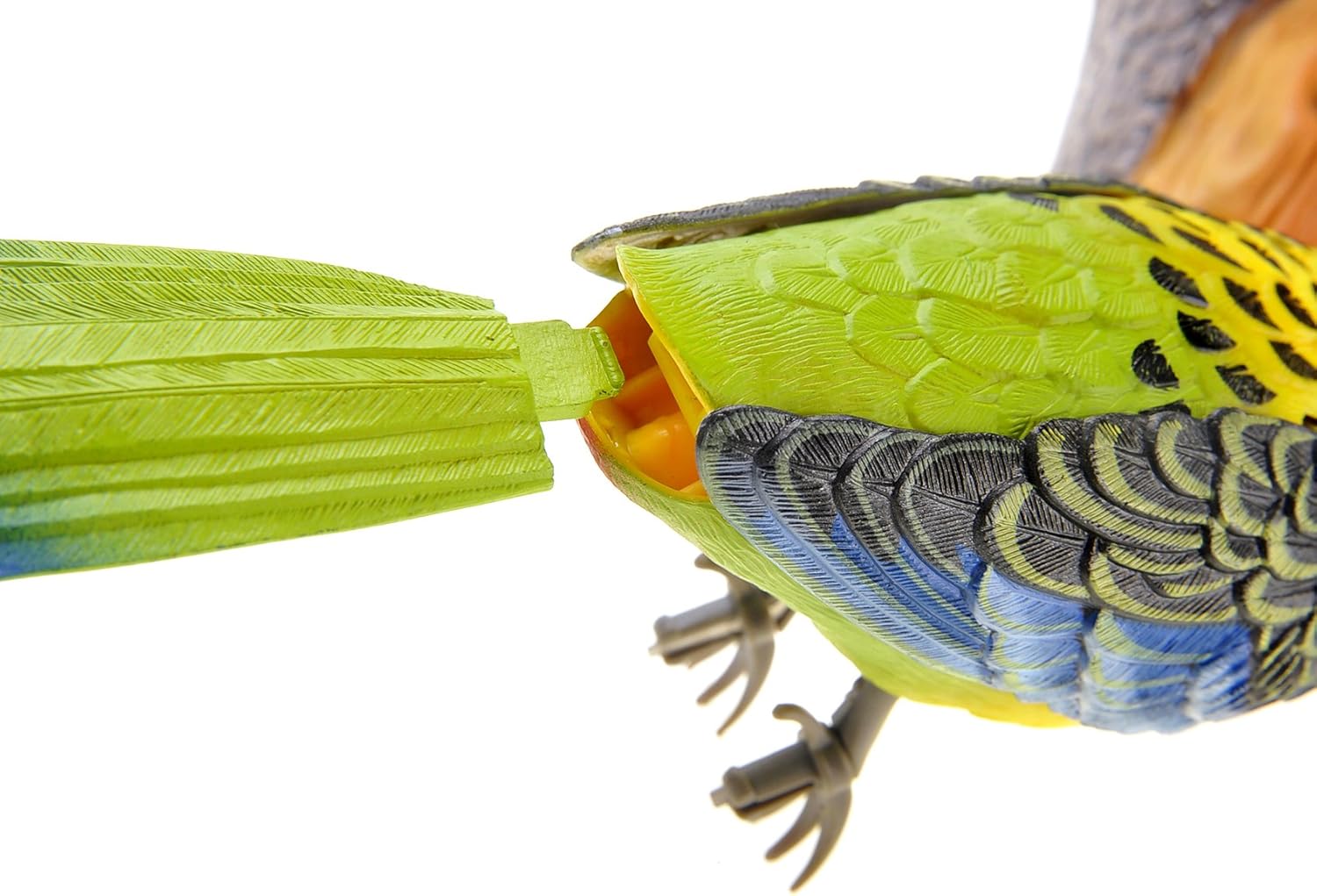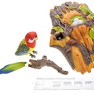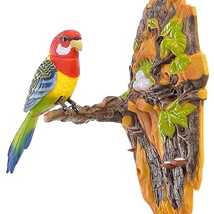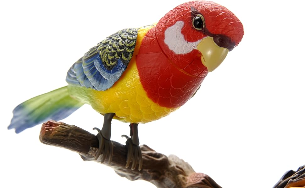 Your friends and family will be amazed on both realistic design and sounds. This bird is based on the eastern Rosella, a broad-tailed parrot native to eastern Australia and to Tasmania. Its perch is literally a tree trunk and has little tiny eggs, with lush green leaves to make it more authentic and realistic. The parrot itself has a variety of colors to make it look unique and elegant. In addition, the bird will move its tail and legs as it sings.