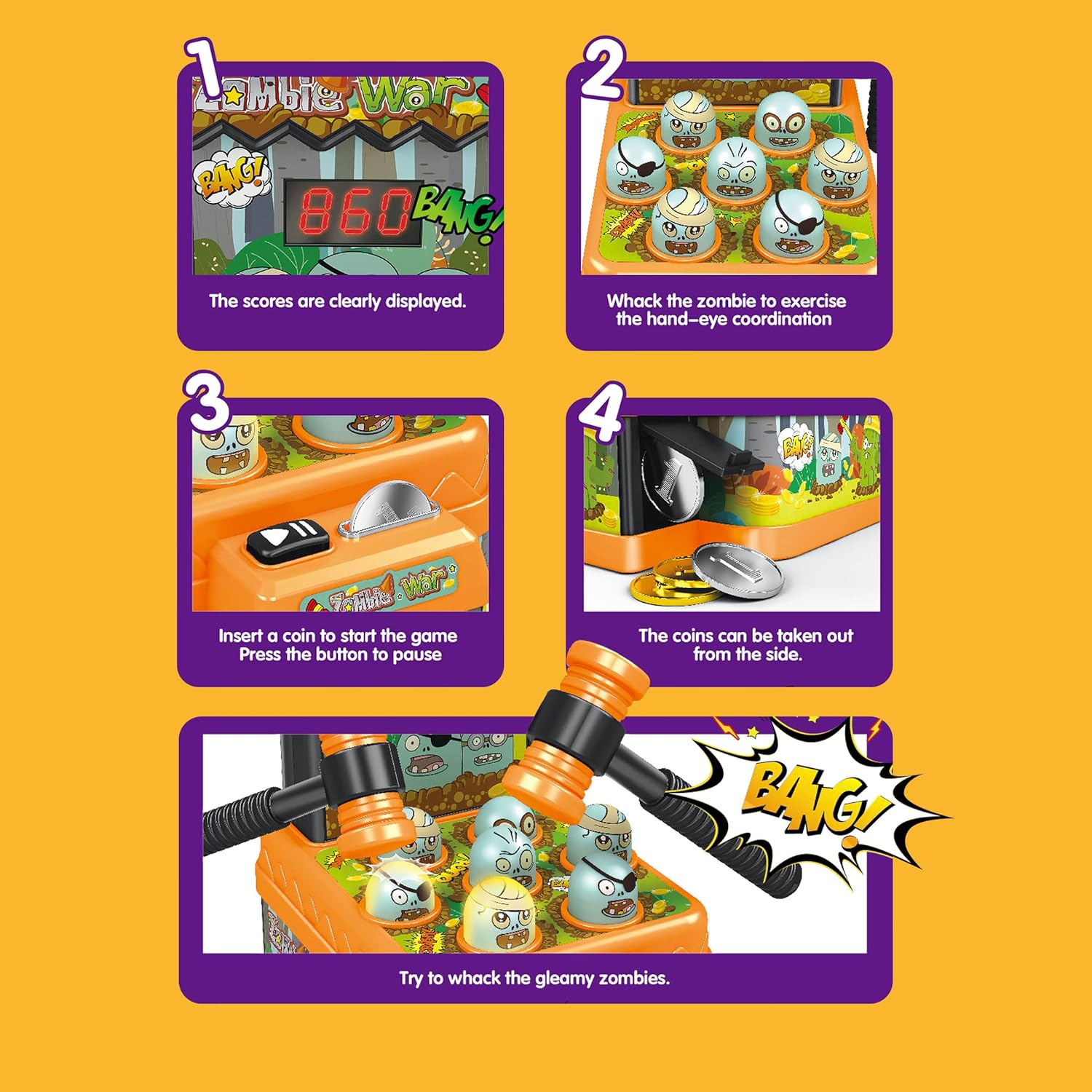 LIGHTS AND SOUND : Watch the lights and hear the fun sounds as your child plays with their new zombie arcade pounding game. Use the coin to start the game! Coins can also be used as rewards for doing being good! Keep score with the live scoreboard and try to beat the score everytime!
