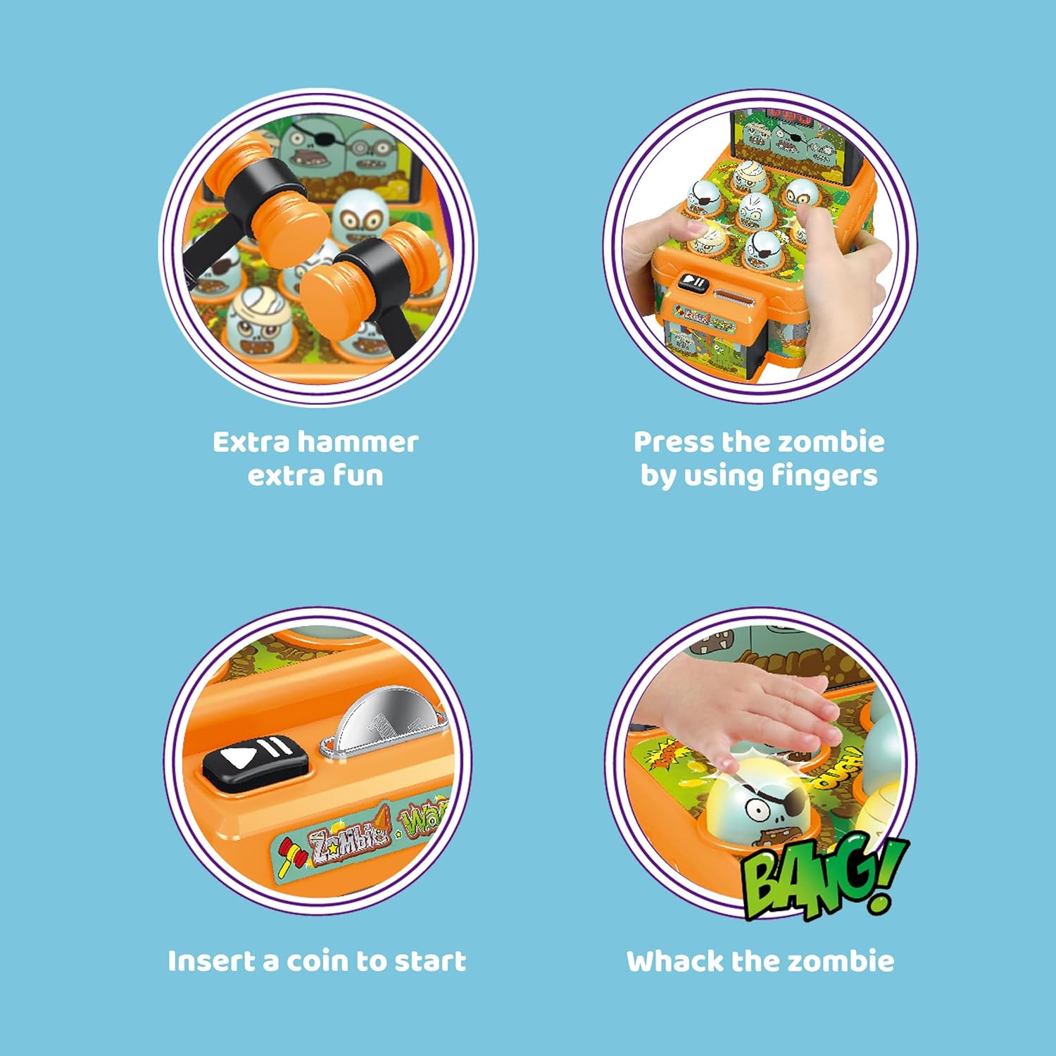 ARCADE : Let your child enjoy the classic children's pounding with this unique zombie design! Funny cartoon zombies will catch your child attention right away! Set comes with 12 coins, 2 hammers, and 7 little zombies to pound.