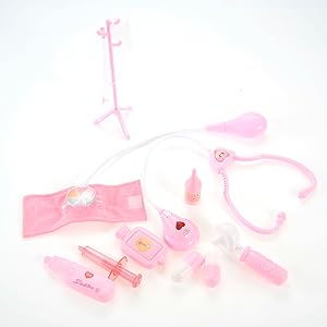 It's doctor checkup time! Comes with 7 different medical tools. The play tools include stethoscope, reflex hammer, syringe needle, clamp, thermometer, magnifier, and a flashlight. Each tool has its own cool unique function.