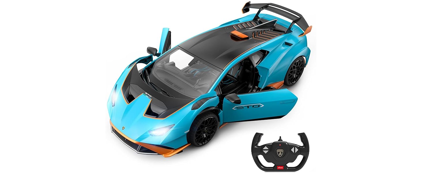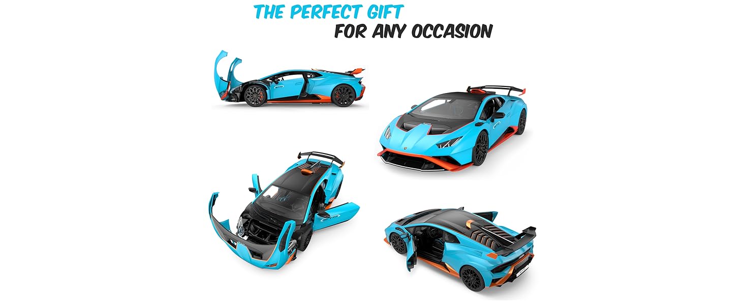 The Lamborghini Huracán STO RC car features rounded edges for safety and durable construction for indoor and outdoor fun. A thrilling toy and stylish display piece, it’s perfect for car enthusiasts of all ages. Ideal as a gift, this model combines safety, style, and high-performance excitement.