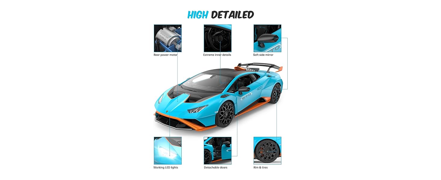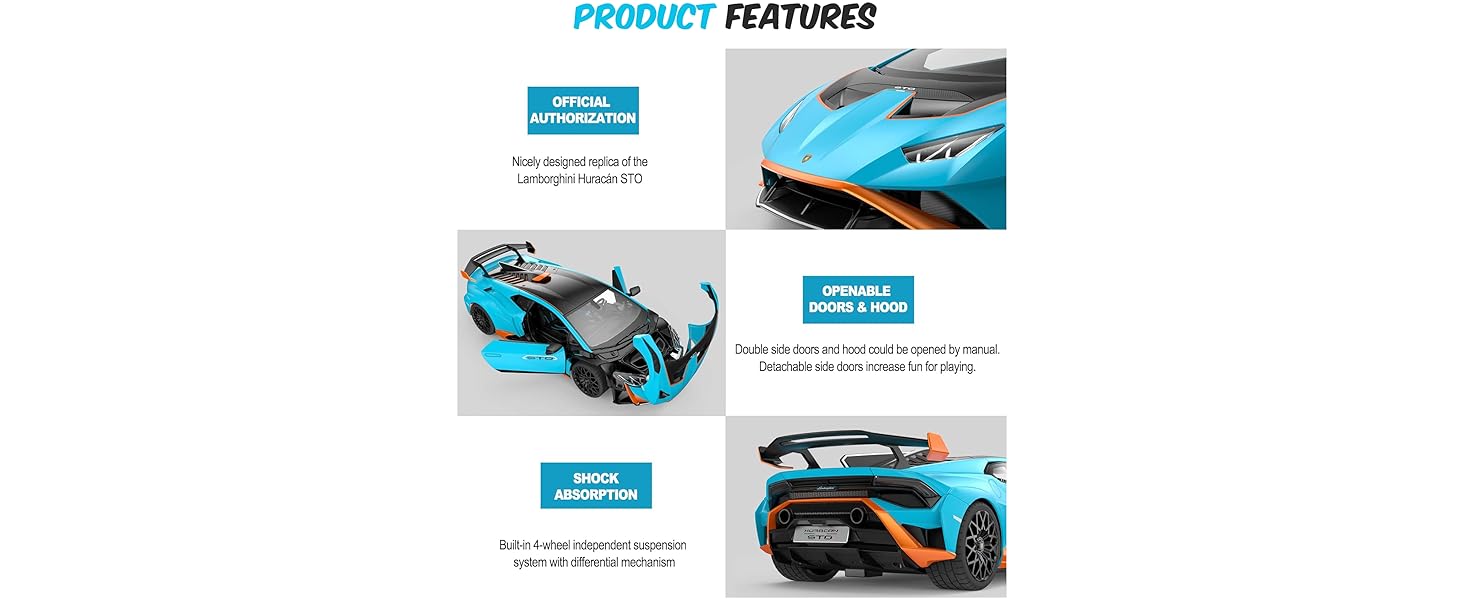 Elevate playtime with the Lamborghini Huracán STO RC car, featuring an openable hood and detachable doors for added realism. Perfect for display or action-packed play, these interactive elements enhance authenticity and excitement, making it a must-have for car enthusiasts of all ages.4o