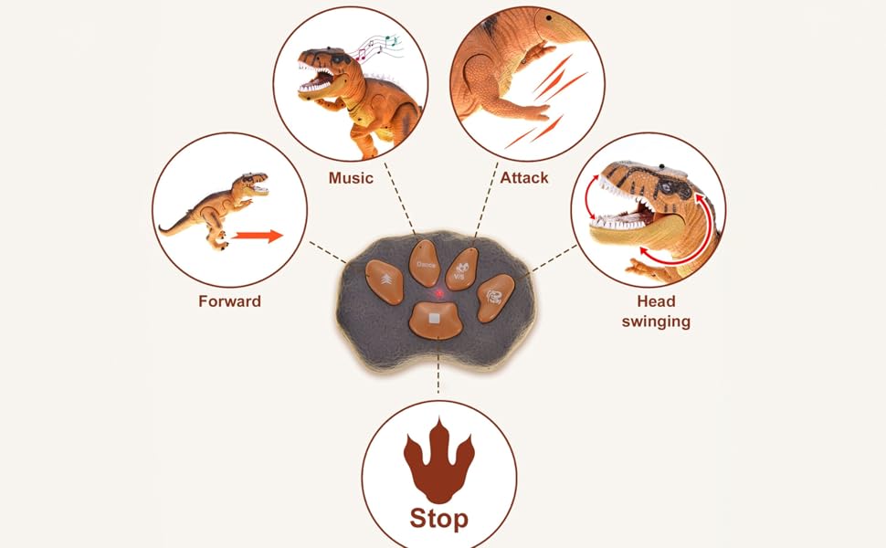 The remote control has various buttons for individual function that is programmed in the T-Rex. There are Forward and Stop button for the movement, Head swinging and Attack button for the action and Music button for the roars and sounds. Plus, the remote control is simple enough for your kids to have full control and comfortable to grab with their hands.