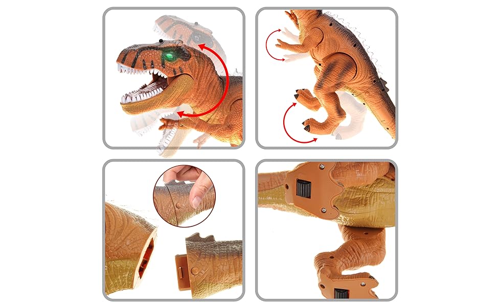 The head, the hands and the feet can be moved to various positions to replicate real life dinosaur movement. This option to have control of the dinosaur's movement will add more excitement for the kids, since the toy is following their orders. The tail is also removable for better storage and plastic wheels are included at the button of the feet, so you don't have to worry about scratching your floors.