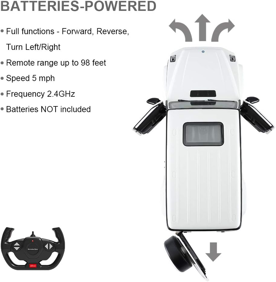Rastar 1:14 Scale Mercedes-AMG G63 Off-Road Remote Control Car Officially licensed by Mercedes-AMG GmbH 1:14 scaled back on the real Mercedes-AMG G63 Highly-detailed interior and exterior: Front doors and rear door opened by manual Working LED headlights and taillights Streamed body line with smooth edges and corners 4-Wheel independent suspension system Shock absorption Diffrential mechanism Rims wrapped in grip soft tires Made of Non-toxic ABS plastic Exquisite interior, like steering wheel, rearview mirror, realistic dashboard and etc. Features: Size: Mercedes-AMG off-roader measures 36.6 x 13.7 x 13.6 cm / Controller measures 5. x 3.5 inch Color available in white Full functions - Forward, reverse, stop, turn left & right Remote range up to 98 feet Speed 5 mph Frequency available in 2.4GHz; allows multi-users to race together Batteries NOT included - Requires 5AA for the vehicle and 2AA for the remote Package includes: 1 x 1/14 Rastar off-road rc Mercedes-AMG G63 1 x dual-grip remote-controller 1 x user guide