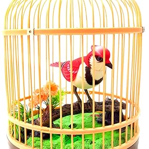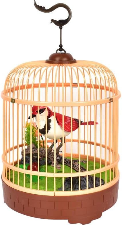 Singing & Chirping Bird in Cage, Realistic Sounds & Movements, Sound Activated, Battery Operated, Great Desk and Room Accessory, Pet Caged Bird Toy (10” x 7”)