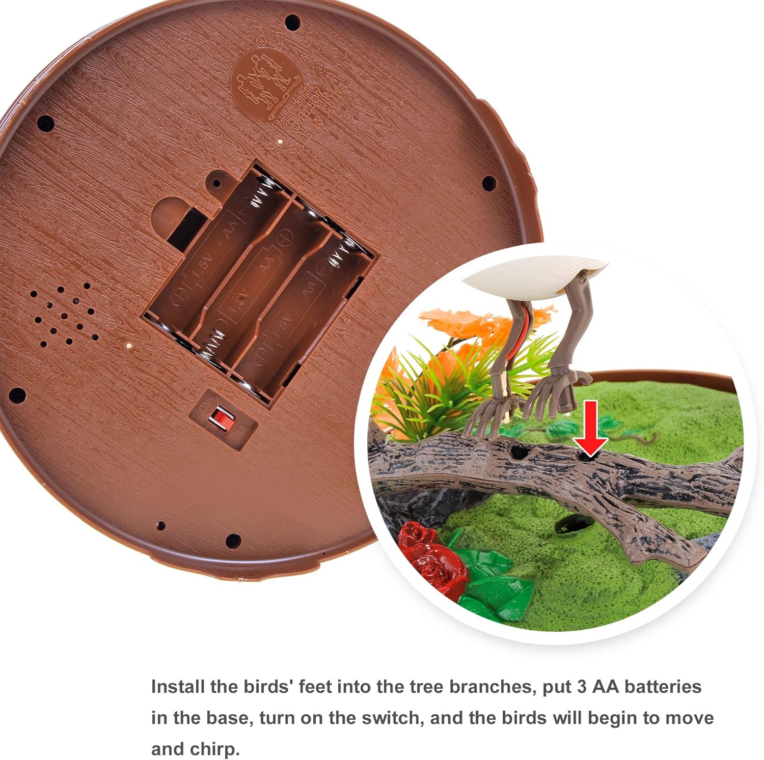 Create a sound near the bird while its resting on the branch and it will start to shake its head, open its mouth, shake its wing and tail and sing a bird song. You must firmly insert the feet into the branch to have good solid contact to power the bird's movement.